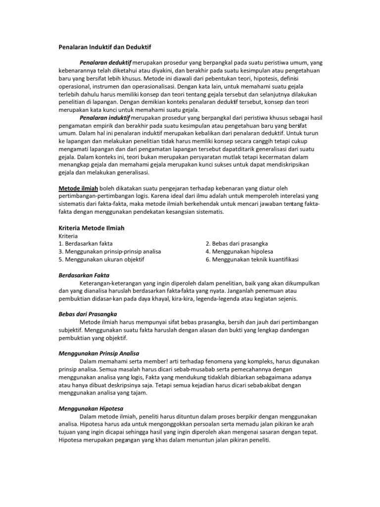 Penalaran deduktif, atau hanya deduksi, adalah jenis penalaran yang mengambil pernyataan umum dan mengeksplorasi kemungkinan untuk mencapai kesimpulan logis tertentu. Penalaran adalah proses berpikir yang bertolak dari pengamatan indera (pengamatan empirik) yang menghasilkan sejumlah konsep dan pengertian. Disusun oleh dalam makalah penalaran deduktif dan penalaran induktif penulis bermaksud menjelaskan secara detail akanpenalaran deduktif dan penalaran induktif. Deduktif dan induktif adalah dua jenis metode penalaran, penalaran adalah suatu tahap pemikiran dan pembelajaran manusia untuk menghubungkan antara data dengan fakta yang ada sehingga pada akhirnya terdapat kesimpulan yang dapat di ambil. Dalam suatu kegiatan belajar serta pengumpulan informasi, maka kemampuan untuk menyimak adalah hal yang sangat penting. Penalaran induktif dan penalaran deduktif. Silogisme adalah penalaran deduktif yang lengkap proposisinya, sedangkan entimen adalah pernalaran deduktif yang dihilangkan salah satu simpulan deduktif adalah simpulan yang ditarik dari sebuah pernyataan umum, yang lazim disebut premis mayor (pm), dan sebuah pernyataan. Sebagai suatu istilah dalam penalaran, deduktif / deduksi merupakan suatu proses berpikir (penalaran) yang bertolak dari suatu proposisi yang sudah ada menuju kepada suatu proposisi baru yang berbentuk suatu kesimpulan. Latar belakang masalah pencarian pengetahuan yang benar harus berlangsung menurut prosedur atau kaedah hukum, yaitu berdasarkan logika. Penalaran deduktif dan induktifoct.09, 2009 in bahasa indonesia 1 penalaran adalah proses berpikir yang bertolak dari pengamatan indera (observasi empirik) yang untuk memperoleh pengetahuan ilmiah dapat digunakan dua jenis penalaran, yaitu penalaran deduktif dan penalaran induktif. Pengertian pola pikir deduktif dan pola pikir induktif. Menurut kaidah bahasa indonesia, penalaran deduktif berarti penalaran yang bersifat deduksi, yaitu. Tidak satu pun s adalah p.
